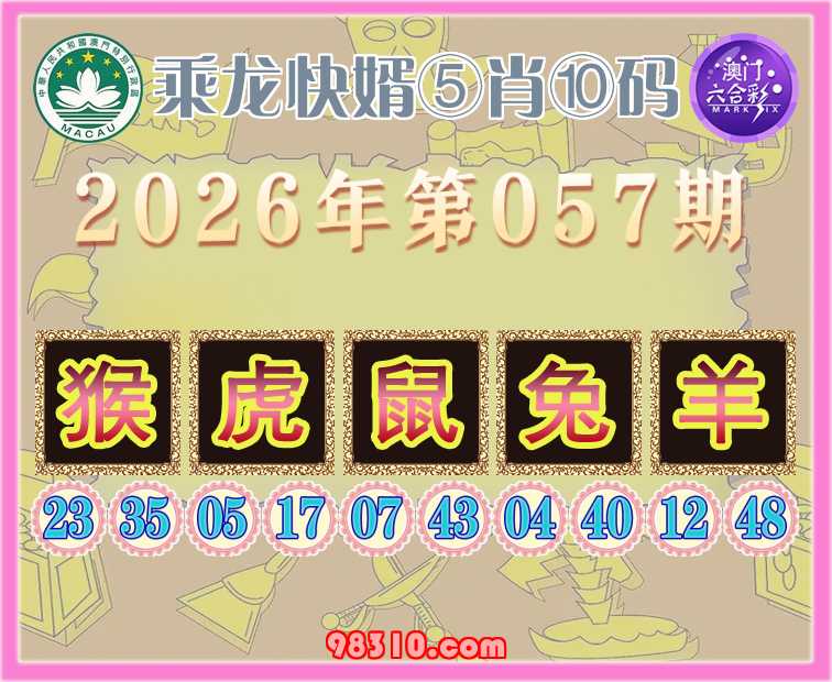 059期:〖乘龙快婿〗 ⑤肖⑩码【虎鸡龙鼠羊】开:鸡10准