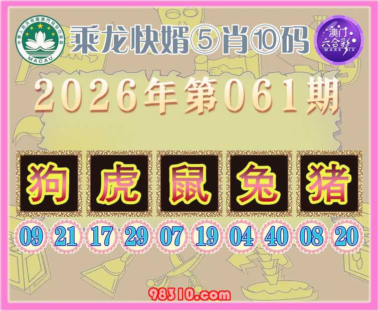 061期:〖乘龙快婿〗 ⑤肖⑩码【狗虎鼠兔猪】开:虎29准
