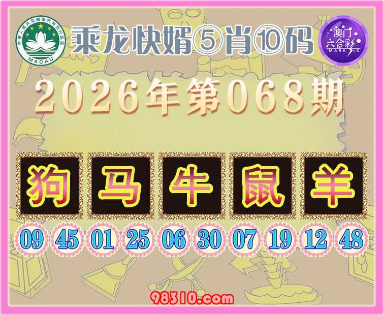 068期:〖乘龙快婿〗 ⑤肖⑩码【狗马牛鼠羊】开:猴23错