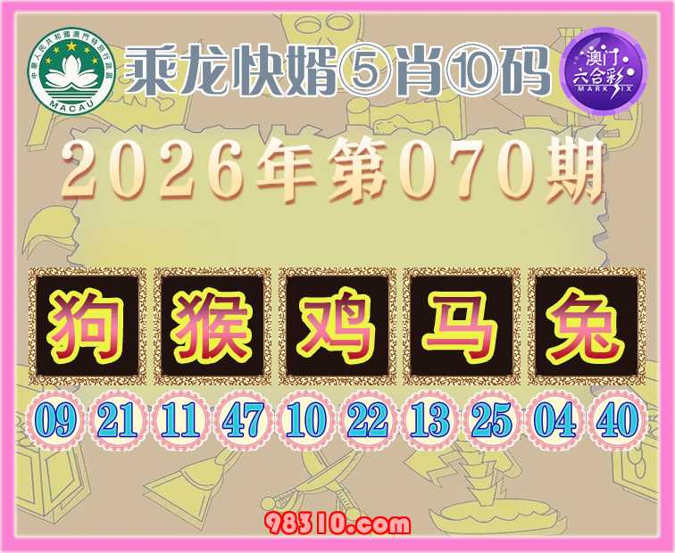 070期:〖乘龙快婿〗 ⑤肖⑩码【狗猴鸡马兔】开:马25准验证上榜