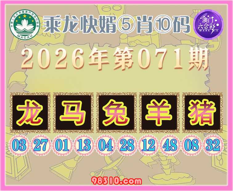 071期:〖乘龙快婿〗 ⑤肖⑩码【龙马兔羊猪】开:羊48准验证上榜