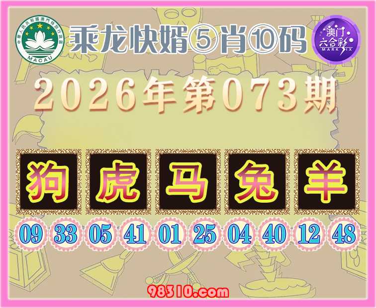 073期:〖乘龙快婿〗 ⑤肖⑩码【狗虎马兔羊】开:00准